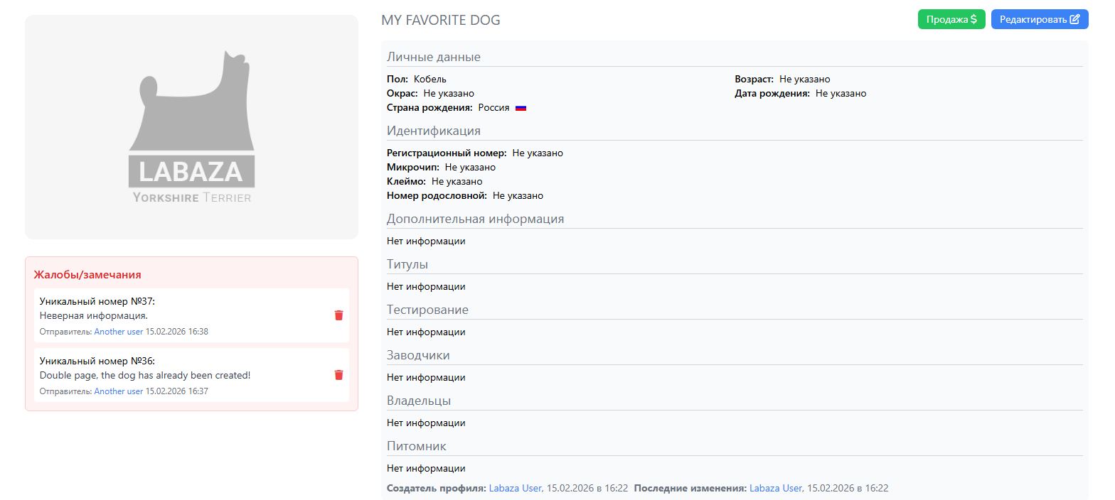 Если на собаку была подана жалоба (например, на некорректные данные, ошибку в информации или неточность), теперь эта информация отображается в профиле конкретной собаки, но только для зарегистрированных и авторизованных пользователей. Гости сайта по-прежнему не видят эту информацию. Удалить жалобу может создатель профиля собаки или администратор системы. Чтобы создать обращение для удаления жалобы, отправьте заявку через форму обратной связи с указанием уникального номера жалобы и пояснением, почему жалоба стала неактуальной.